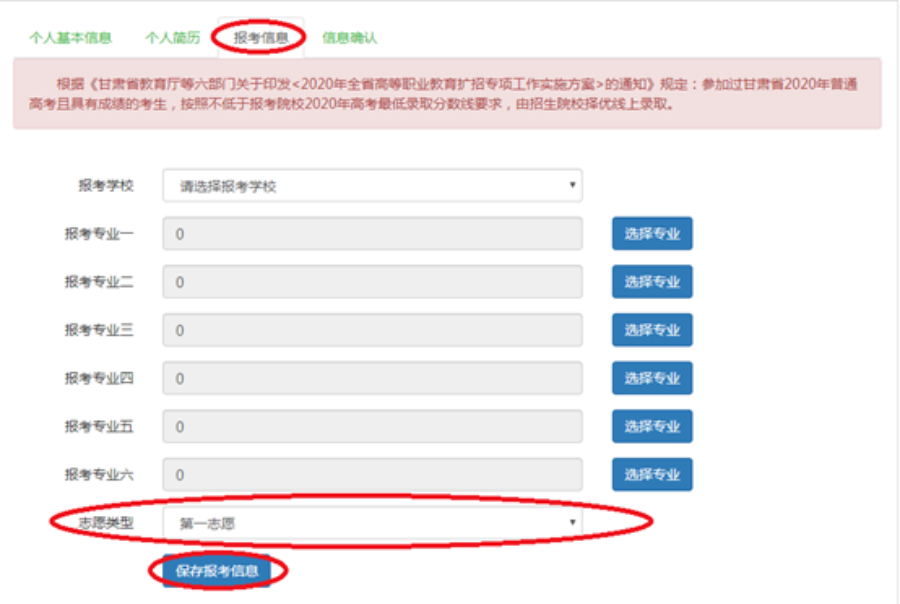 11.第三步,填寫報考信息。請考生務(wù)必注意,本次甘肅省高等職業(yè)教育擴(kuò)招專項考試可以填報兩所院校志愿,請在“志愿類型”一欄中選擇所報志愿為第一志愿或是第二志愿。錄取過程中,先對所報第一志愿的院校進(jìn)行錄取,如第一志愿院校未被錄取,再對第二志愿院校進(jìn)行錄取。