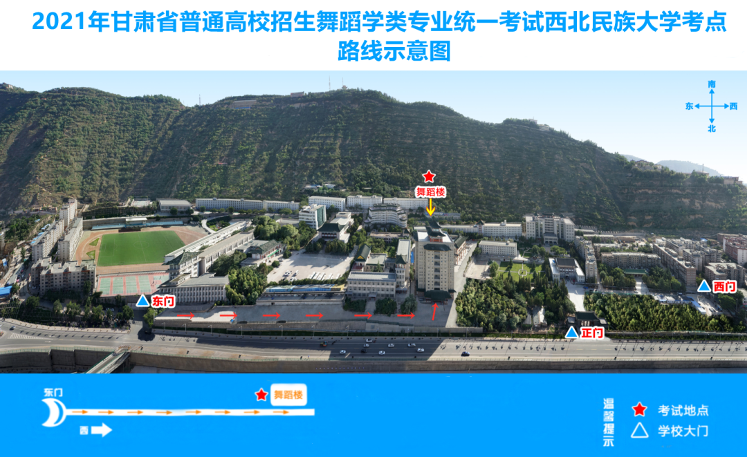 考生須于考試時間提前一小時,持身份證、報名登記表、省藝術類準考證、考試前一天健康出行碼、行程卡等證件,由西北民族大學西北新村校區東門,經體溫檢查后由工作人員統一引導進入校園,前往舞蹈樓906、907室候考。考試區域實行閉環管理,考生不得從其他校門進出。