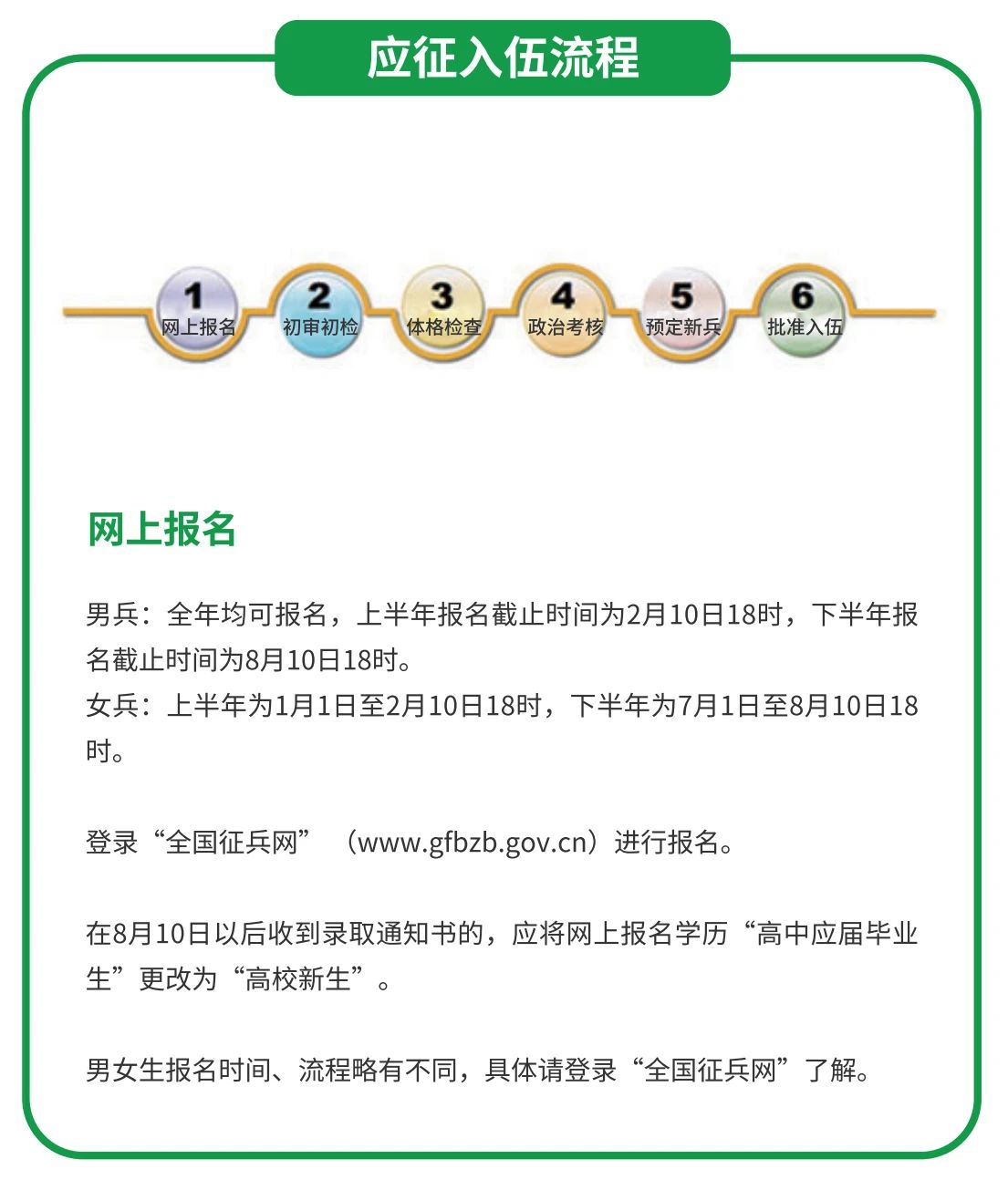1.應征地:高校新生應當在戶籍所在地參加應征;高校應屆畢業(yè)生和在校生可在學校所在地參加應征,也可在入學前戶籍所在地參加應征。