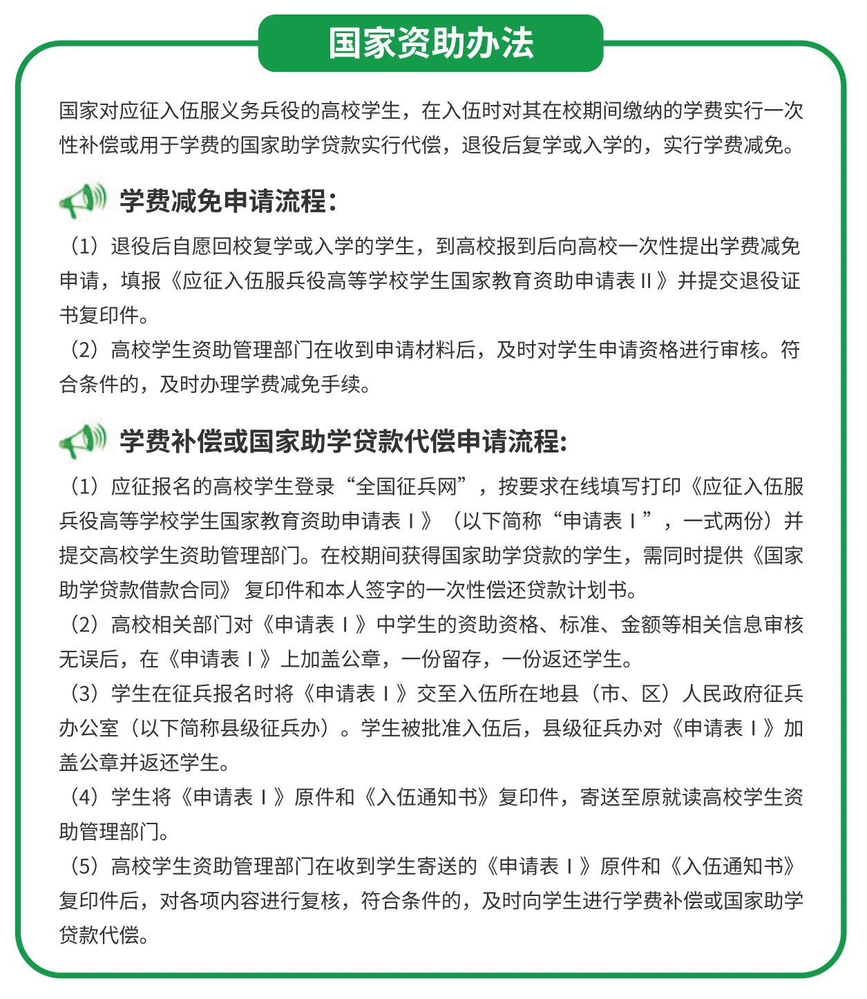 3.國家資助學費:國家對應征入伍服義務兵役高校學生,在入伍時對其在校期間繳納的學費實行一次性補償或用于學費的國家助學貸款實行代償;對應征入伍服義務兵役前正在高等學校就讀的學生(含按國家招生規(guī)定錄取的高校新生),退役后自愿復學或入學的,實行學費減免。學費補償、國家助學貸款代償以及學費減免的標準,本專科生每生每年最高不超過12000元,研究生每生每年最高不超過16000元。