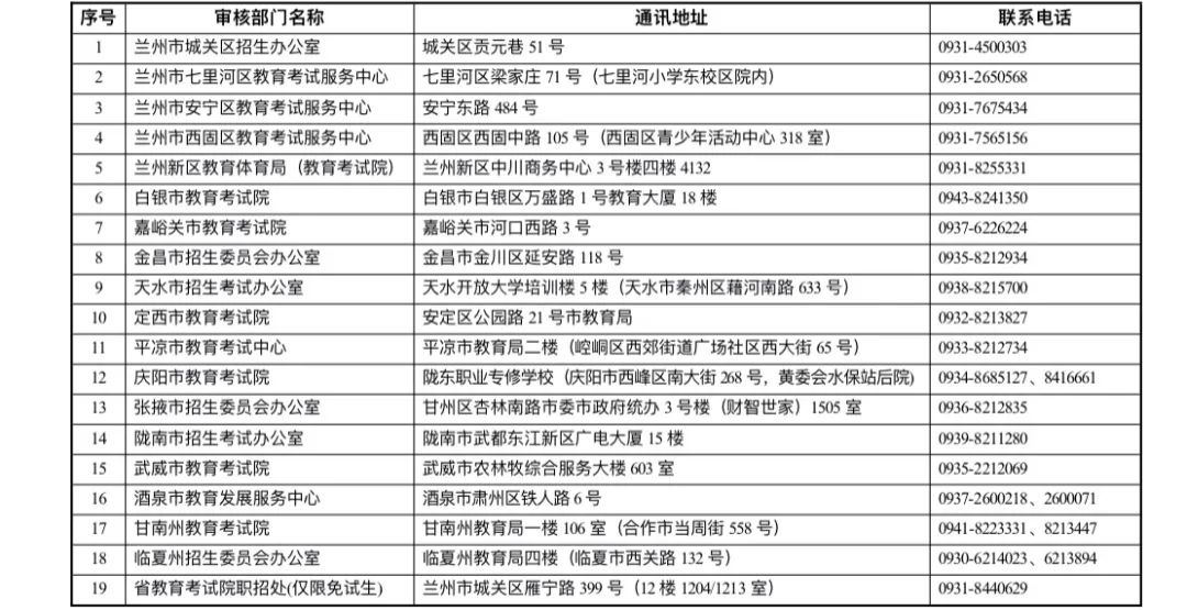 2023年甘肅省成人高校招生網(wǎng)上報(bào)名各地審核部門地址及聯(lián)系電話匯總表
