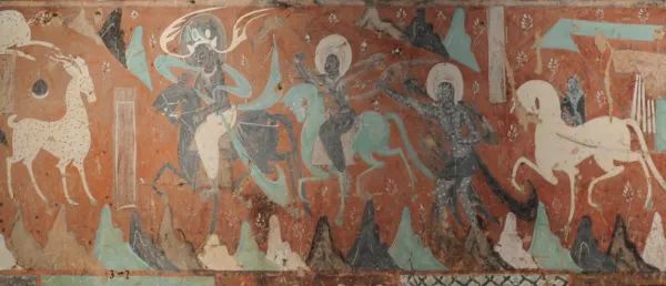 《郊游》敦煌莫高窟第257窟 《鹿王本生圖》是北魏時期的作品,屬敦煌壁畫早期作品,其造型用線簡練概括,結(jié)構清晰合理,構圖長卷平鋪,色彩協(xié)調(diào)統(tǒng)一,具有中國傳統(tǒng)審美特點,從內(nèi)容到表現(xiàn)手法都體現(xiàn)出中國傳統(tǒng)繪畫最基本的特征。
