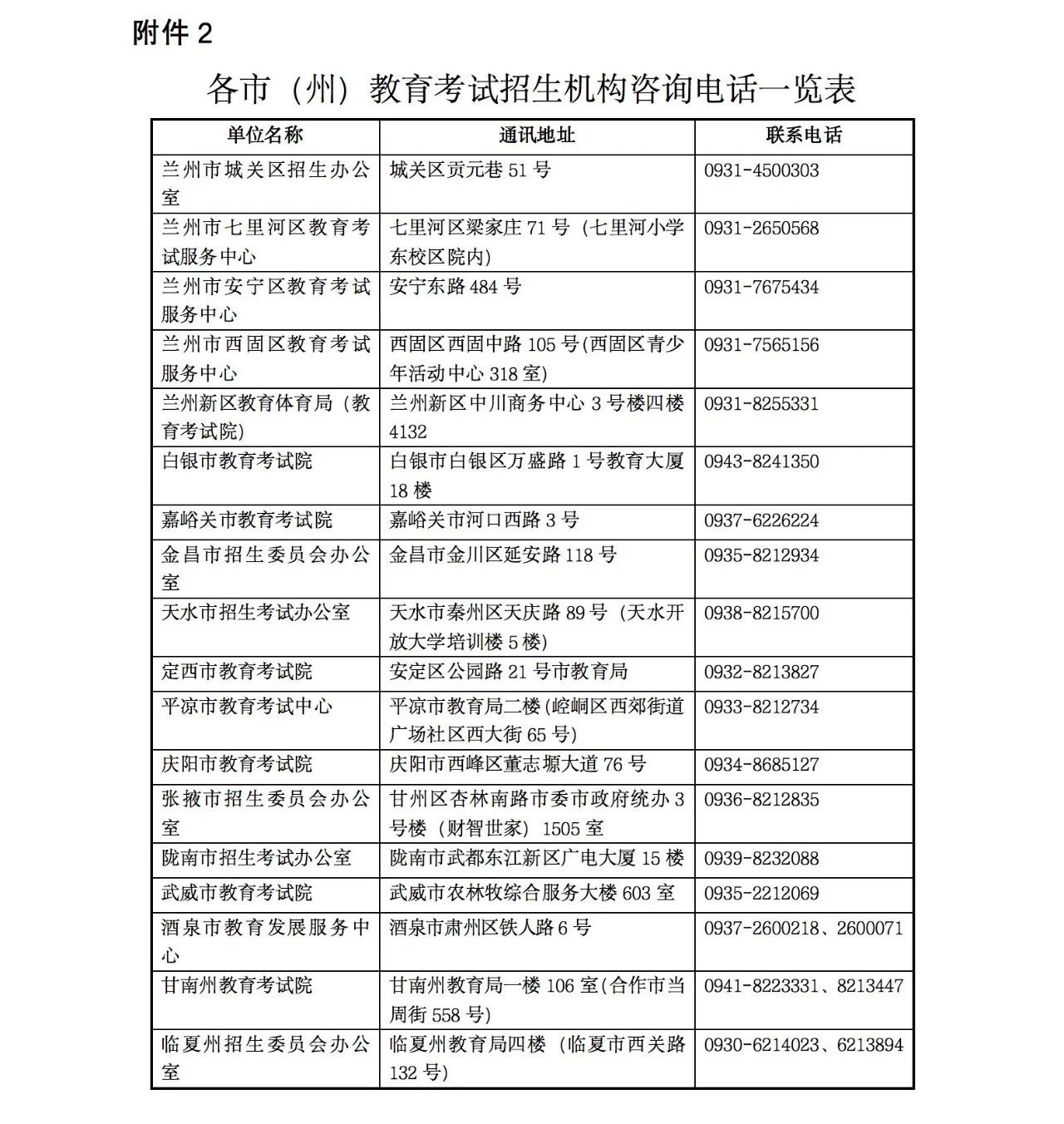 2.各市(州)教育考試招生機構咨詢電話一覽表