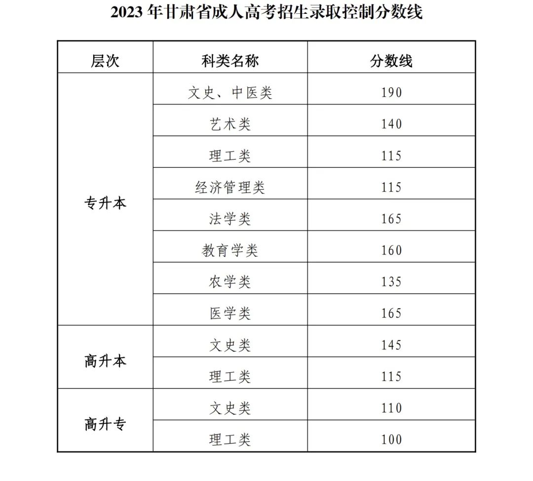 2023 年甘肅省成人高考招生錄取控制分數線