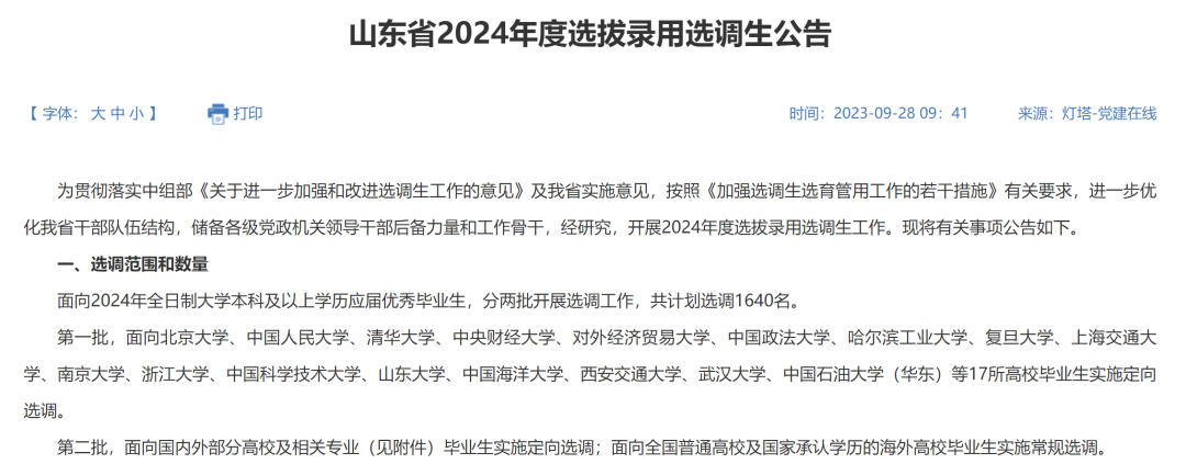 山東省2024年選調(diào)生選拔面向2024年全日制大學(xué)本科及以上學(xué)歷應(yīng)屆優(yōu)秀畢業(yè)生,分兩批開(kāi)展選調(diào)工作,共計(jì)劃選調(diào)1640名。