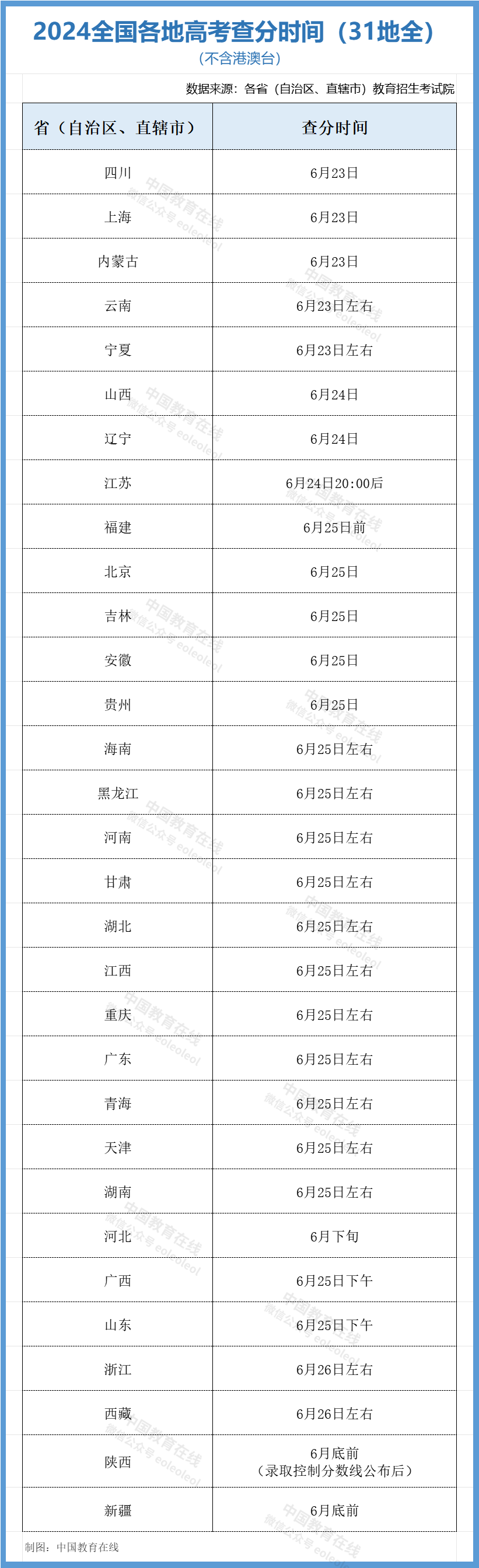 據全國各省(自治區、直轄市)教育招生考試院消息,截至目前,全國31個省(直轄市、自治區)[注:不含港澳臺] 都已公布了今年高考成績查詢時間及相關信息。