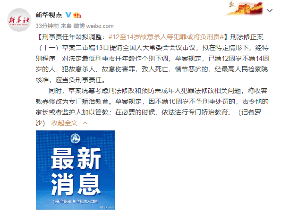 刑事責任年齡擬調整:12至14歲故意殺人等犯罪或將負刑責刑法修正案(十一)草案二審稿13日提請全國人大常委會會議審議,擬在特定情形下,經特別程序,對法定最低刑事責任年齡作個別下調。草案規定,已滿12周歲不滿14周歲的人,犯故意殺人、故意傷害罪,致人死亡,情節惡劣的,經最高人民檢察院核準,應當負刑事責任。同時,草案統籌考慮刑法修改和預防未成年人犯罪法修改相關問題,將收容教養修改為專門矯治教育。草案規定,因不滿16周歲不予刑事處罰的,責令他的家長或者監護人加以管教;在必要的時候,依法進行專門矯治教育。