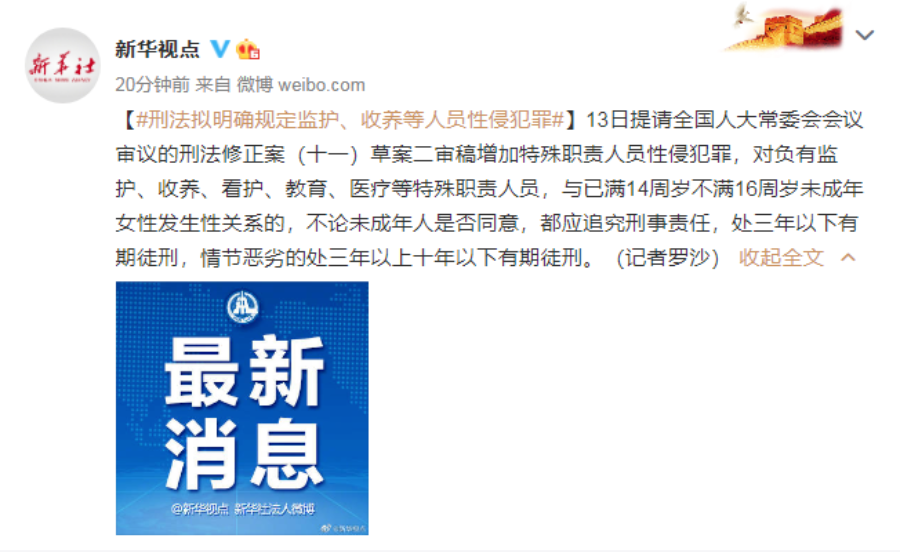 13日提請全國人大常委會會議審議的刑法修正案(十一)草案二審稿增加特殊職責人員性侵犯罪,對負有監護、收養、看護、教育、醫療等特殊職責人員,與已滿14周歲不滿16周歲未成年女性發生性關系的,不論未成年人是否同意,都應追究刑事責任,處三年以下有期徒刑,情節惡劣的處三年以上十年以下有期徒刑。