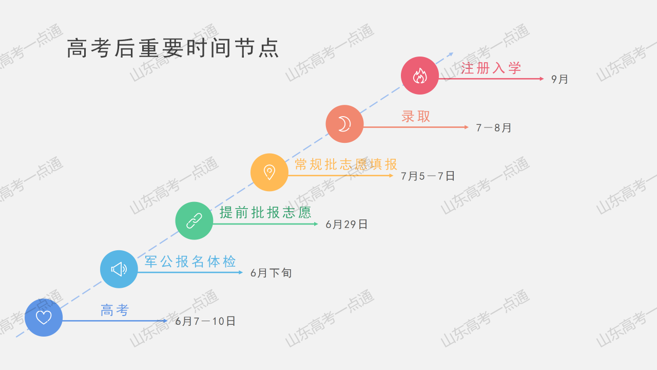 高考之后的重要時間節點有,6月7日到10日,按照以往慣例會在這個時間進行高考,高考結束之后,會進行軍事、公安、政法院校的報名和體檢,基本上是在6月下旬。2024年是6月29日,報考提前批。7月5日到7日,報考常規批的志愿。7月到8月是正常錄取,錄取結束了,9月會有注冊入學,對于當時沒有被錄取的考生還有最后一次錄取機會。這些高考時間節點是按照2024年的時間來舉例的,2025年的高考具體時間以及相應的安排需要以當時的發布為準。