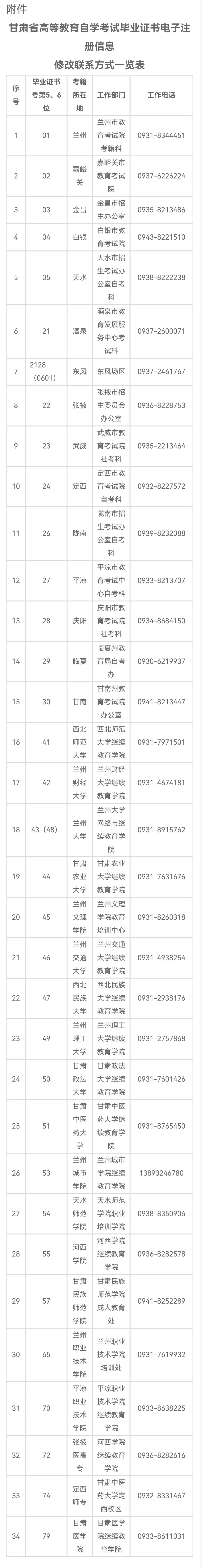 附件:甘肅省高等教育自學考試畢業證書電子注冊信息修改聯系方式一覽表