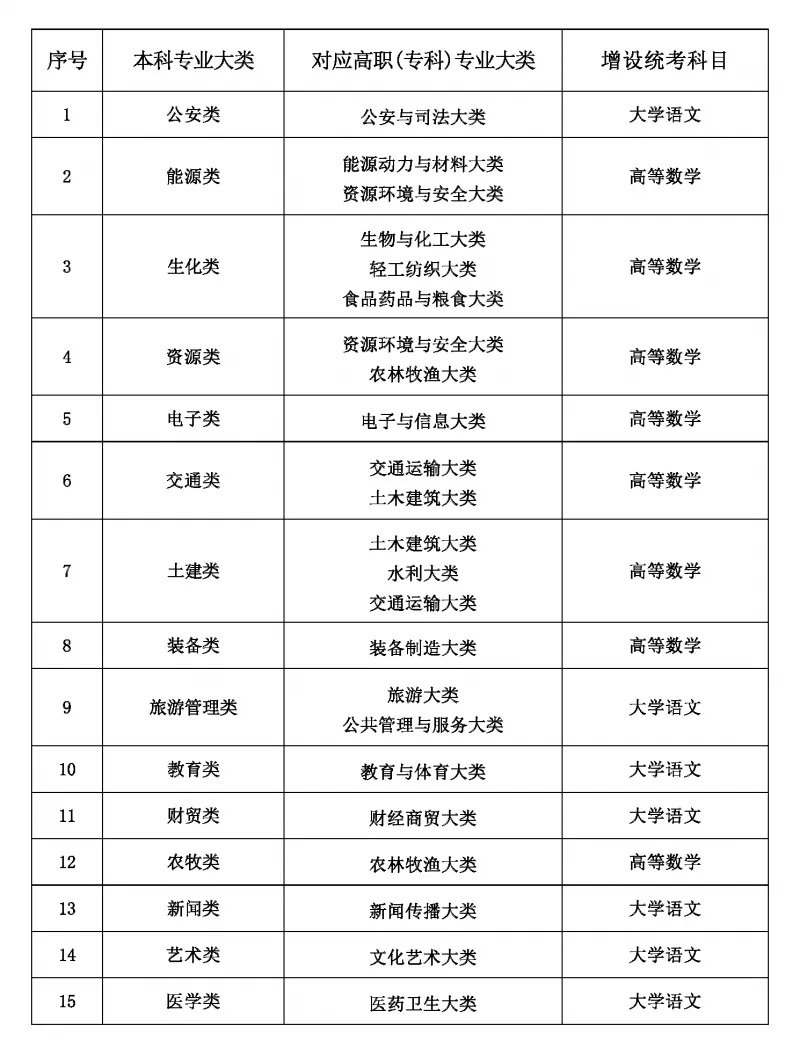 根據甘肅省教育廳《關于全省普通專升本考試增設大學語文高等數學統考科目試行的意見》(甘教職成函〔2024〕20號)精神,從2025年起,我省普通專升本統一考試將增考《大學語文》和《高等數學》兩門統考科目,具體專業大類增考科目見附件。考試大綱見《關于印發<2023年甘肅省普通高校高職(專科)升本科統一考試招生工作實施方案>的通知》(甘招委發〔2023〕2號)附件5、6。