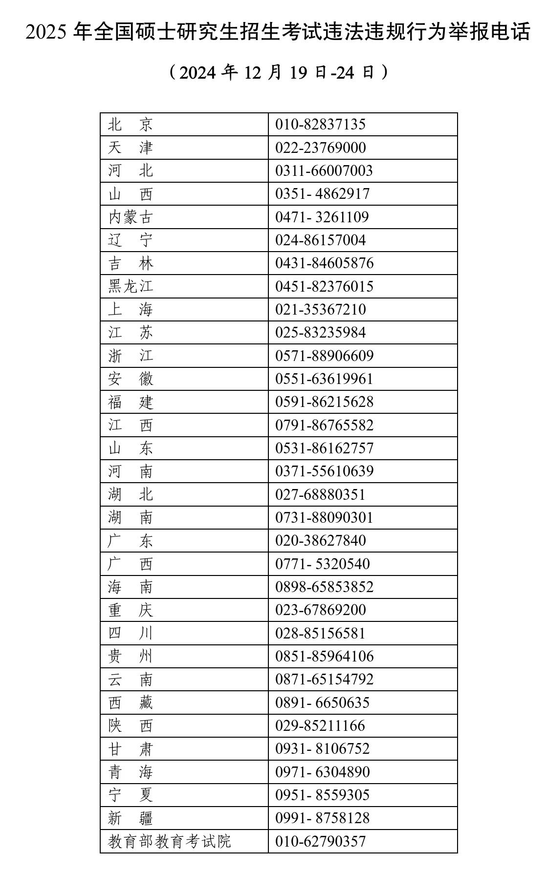 現將2025年全國碩士研究生招生考試違法違規行為舉報電話向社會公告,歡迎參與監督,共同營造良好考試環境。