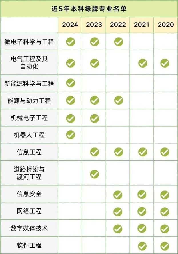 據《2024年中國本科生就業報告》統計,近五年被列為綠牌次數最多的本科專業是信息工程、電氣工程及其自動化(均為4次),其后是微電子科學及工程、信息安全、網絡工程、能源與動力工程、數字媒體技術(均為3次)等。