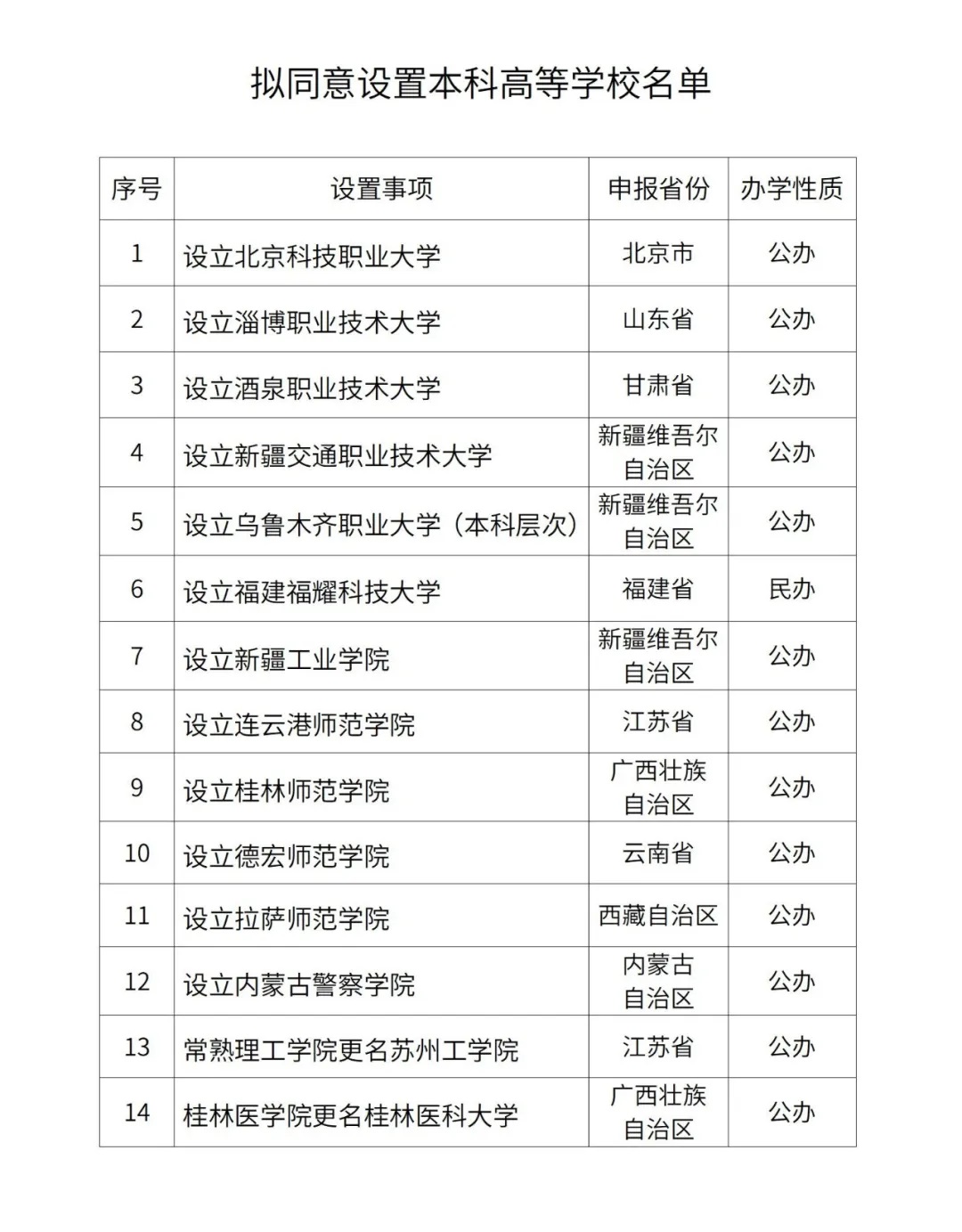 1月13日,教育部發布關于擬同意設置本科高等學校的公示。根據《中華人民共和國高等教育法》《普通高等學校設置暫行條例》《普通本科學校設置暫行規定》《本科層次職業學校設置標準(試行)》等有關規定以及第八屆全國高等學校設置評議委員會考察評議結果,經教育部黨組會議審議,