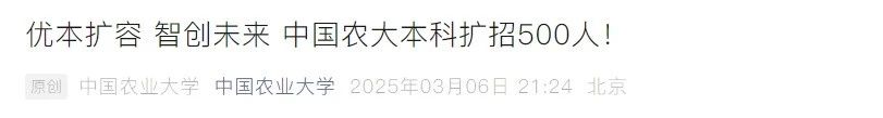 據中國農業大學微信公眾號消息,2025年,適逢中國農業大學建校120周年之際,為響應國家重大戰略需求,推進拔尖創新人才自主培養。學校將扎實推進優質本科擴容,增加500名本科招生名額,重點面向國家急需的前沿技術和新興業態,緊緊圍繞糧食安全、生物智造、人工智能與裝備制造、綠色能源與可持續發展、食品安全與人類健康等學科領域擴大招生規模,同時計劃開設院士班、卓越工程師班等人才培養班型。