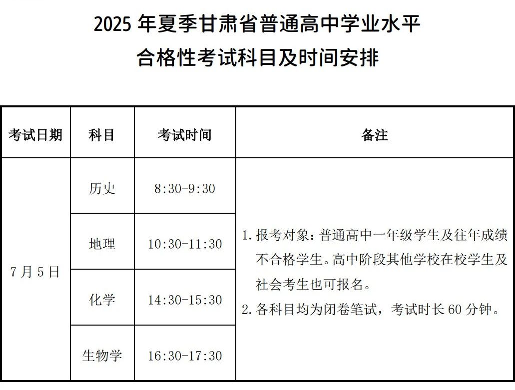 2025年夏季高中學業水平合格性考試科目及時間安排