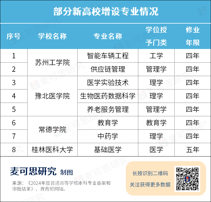 此外,對照教育部網站發布全國普通高等學校名單(截至2024年6月20日),我們注意到共有蘇州工學院、豫北醫學院、常德學院、桂林醫科大學等4所新高校,審批通過增設8個新專業。