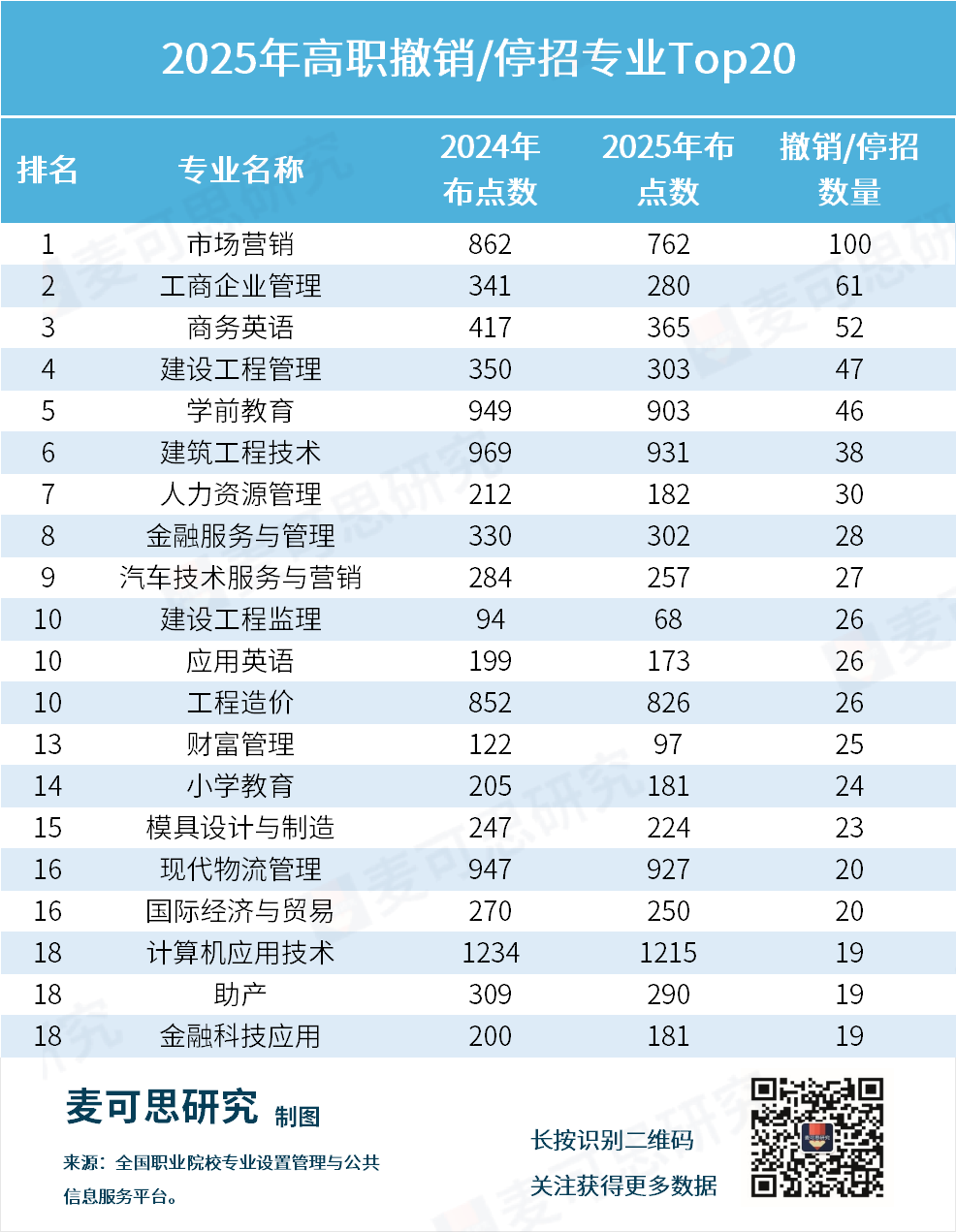 進入2025年高職撤銷/停招專業榜前十的專業還有建設工程管理(減少47個專業點)、學前教育(減少46個專業點)、建筑工程技術(減少38個專業點)、人力資源管理(減少30個專業點)、金融服務與管理(減少28個專業點)、汽車技術服務與營銷(減少27個專業點)、建設工程監理(減少26個專業點)、應用英語(減少26個專業點)、工程造價(減少26個專業點)。