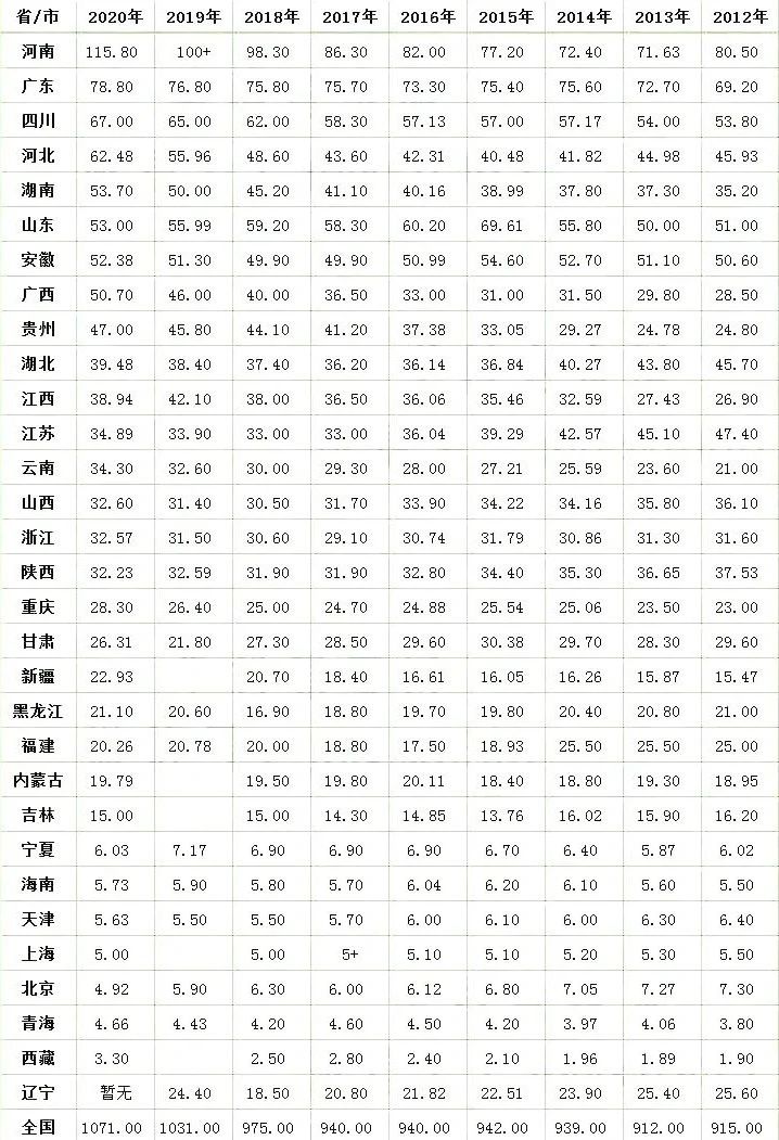 中西部地區,是對我國中部地區和西部地區的總稱,其主要包括河北、山西、內蒙古、吉林、黑龍江、安徽、江西、河南、湖北、湖南、廣西、海南、重慶、四川、貴州、云南、西藏、陜西、甘肅、青海、寧夏、新疆22個省(區、市)。這張統計表中,統計了全國31個省市的考生人數,2020年高考人數在40萬以上的省份,共有9個省份,分別是:河南、廣東、四川、河北、湖南、山東、安徽、廣西和貴州。我們看到,既是“中西部地區省份”,又是“考生大省”的,多達7個,它們分別是河南、四川、河北、湖南、安徽、廣西、貴州。我相信,這幾個省的名字在每年的高考季,總有那么幾個你會聽到。它們的情況要么考生人數眾多,要么經濟發展水平落后,要么省內優質高校資源稀缺。