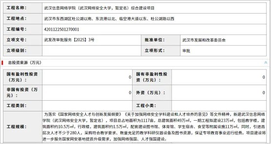 2025年2月,武漢公共資源交易平臺發(fā)布武漢信息網(wǎng)絡(luò)學(xué)院(武漢網(wǎng)絡(luò)安全大學(xué),暫定名)綜合建設(shè)項目招標(biāo)公告登記。