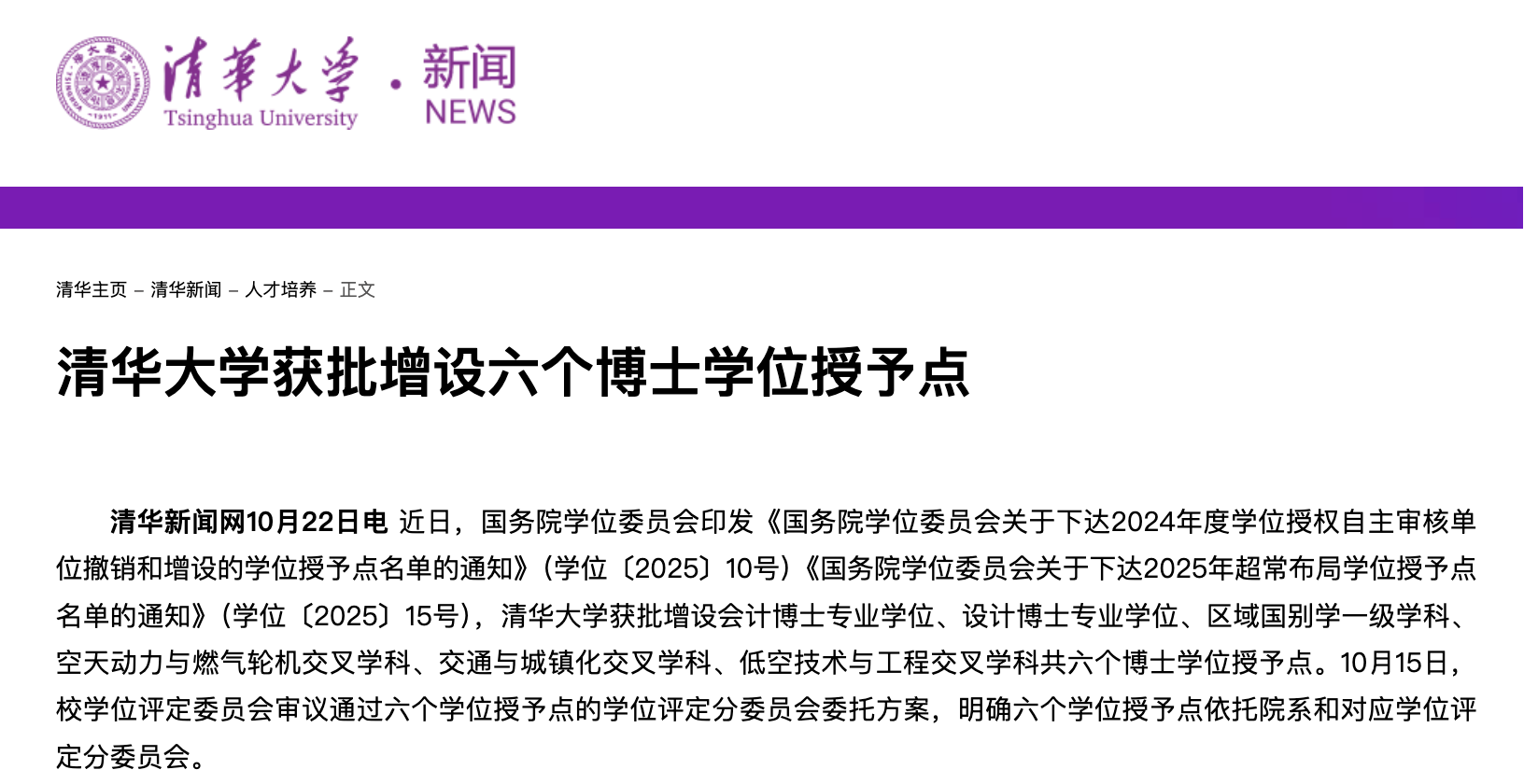 據(jù)清華大學(xué)新聞網(wǎng)消息,近日,國(guó)務(wù)院學(xué)位委員會(huì)印發(fā)《國(guó)務(wù)院學(xué)位委員會(huì)關(guān)于下達(dá)2024年度學(xué)位授權(quán)自主審核單位撤銷和增設(shè)的學(xué)位授予點(diǎn)名單的通知》(學(xué)位〔2025〕10號(hào))《國(guó)務(wù)院學(xué)位委員會(huì)關(guān)于下達(dá)2025年超常布局學(xué)位授予點(diǎn)名單的通知》(學(xué)位〔2025〕15號(hào)),清華大學(xué)獲批增設(shè)會(huì)計(jì)博士專業(yè)學(xué)位、設(shè)計(jì)博士專業(yè)學(xué)位、區(qū)域國(guó)別學(xué)一級(jí)學(xué)科、空天動(dòng)力與燃?xì)廨啓C(jī)交叉學(xué)科、交通與城鎮(zhèn)化交叉學(xué)科、低空技術(shù)與工程