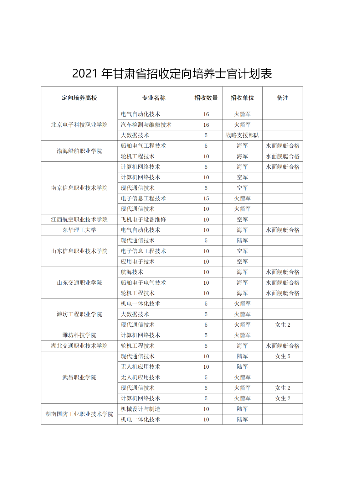 根據國家教育部、軍委政治工作部、軍委國防動員部《關于做好2021年招收定向培養士官工作的通知》要求,為深入貫徹軍民融合發展戰略,著力培養軍隊建設需要的高素質士官人才,現就2021年我省招收定向培養士官工作有關問題公告如下: