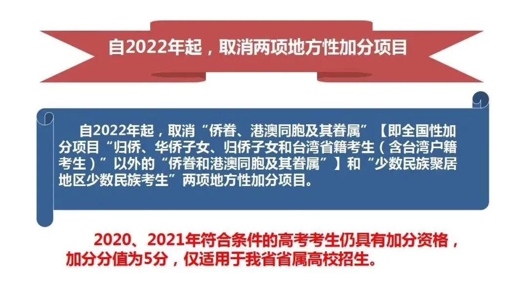 (一)歸僑、華僑子女、歸僑子女考生和臺灣省籍考生(含臺灣戶籍考生),加分分值從2021年起從10分調整為5分,可面向所有高校投檔時使用。(二)少數民族考生,加分分值從2021年起從10分調整為5分,加分對象調整為全省19個民族鄉的少數民族考生,以及高山(享受高山補貼)和無橋梁、海堤與大陸相連的海島等少數民族考生。其中2021年至2023年,少數民族考生加分可面向所有高校投檔時使用;2024年至2025年,少數民族考生加分僅面向省屬高校投檔時使用。2020年9月,安徽發布高考加分政策調整:自2022年起,取消兩項地方性加分項目,其中便包括取消少數民族考生加分政策。1、僑眷、港澳同胞及其眷屬,即全國性加分項目“歸僑、華僑子女、歸僑子女和臺灣省籍考生(含臺灣戶籍考生)”以外的“僑眷和港澳同胞及其眷屬”。2、少數民族聚居地區少數民族考生。2020、2021年符合兩項地方性加分項目條件的高考考生仍具有加分資格,加分分值為5分,僅適用于安徽省省屬高校招生。2019年12月17日,江西省印發《江西省關于進一步深化高考加分改革的實施方案》,其中規定,對經省政府批準的民族鄉(貴溪市樟坪畬族鄉等8個民族鄉)和按法定程序批準且經省有關部門向社會公示的民族村(鉛山縣陳坊鄉長壽畬族村等82個民族村),少數民族考生加分政策實行3年過渡期,即2020-2022年過渡期內加5分不變,自2023年開始不再加分。2020年1月,遼寧省教育廳等五部門聯合發布《遼寧省進一步深化高考加分改革實施方案》(簡稱《實施方案》),也對高考加分政策進行了調整。在少數民族考生加分項目方面,喀左、阜新、新賓、清原、鳳城、岫巖、寬甸、北鎮、本溪、桓仁縣的少數民族考生,從2023年高考起,在考生統考成績總分的基礎上增加4分投檔,由高校審查決定是否錄取。從2026年高考起,取消該項高考加分政策。天津市則將對少數民族考生的加分照顧調整為優先錄取。據天津市教育招生考試院消息,自2023年高考起,“少數民族考生報考天津市屬高校時增加5分投檔”的政策調整為“在本市所屬高校錄取時,少數民族考生在與漢族考生同等條件下,優先錄取。”