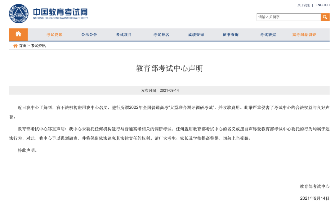 9月14日,教育部考試中心通過中國教育考試網(wǎng)發(fā)布聲明稱,近日有不法機(jī)構(gòu)盜用教育部考試中心名義,進(jìn)行所謂2022年全國普通高考“大型聯(lián)合測(cè)評(píng)調(diào)研考試”,并收取費(fèi)用。此舉嚴(yán)重侵害了考試中心的合法權(quán)益與良好聲譽(yù)。