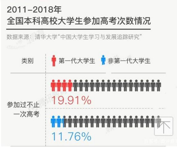 2011-2018年,全國本科大學里第一代大學生(即特指父母沒有讀過大學、通過自己的不懈努力進入大學的學生)一直保持70%以上的占比。同時,與非第一代大學生相比,更多的第一代大學生參加過多次高考(即復讀),占比達到19.91%。