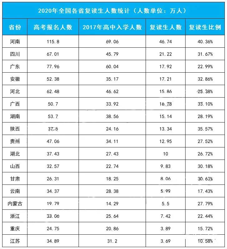 此前各省公布了復讀生人數,從整理出來的表格數據可以看出,河南作為高考大省,其高考報名人數和復讀生人數均遙遙領先于其他省份,復讀生人數為46.74萬,復讀生比例達到了40.36%,可見整個河南省2021年高考的競爭將會空前激烈。