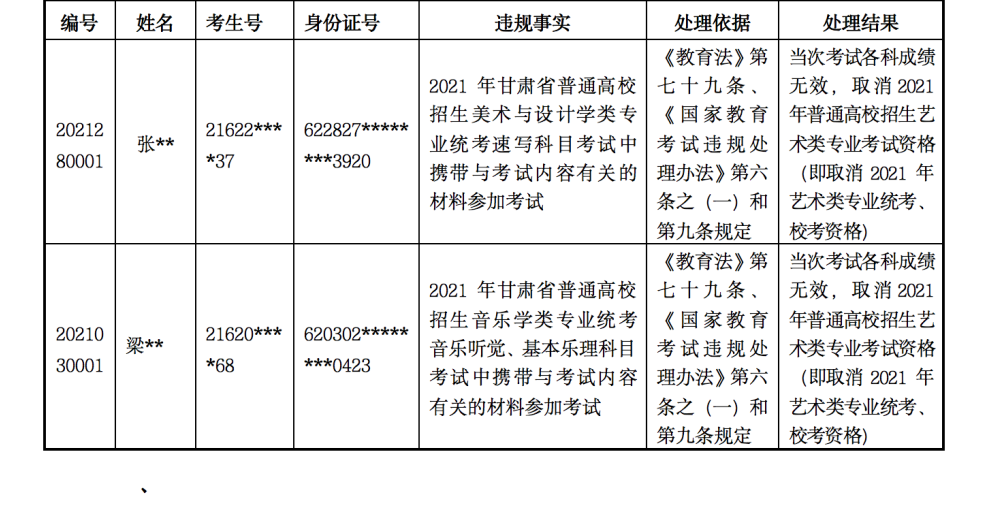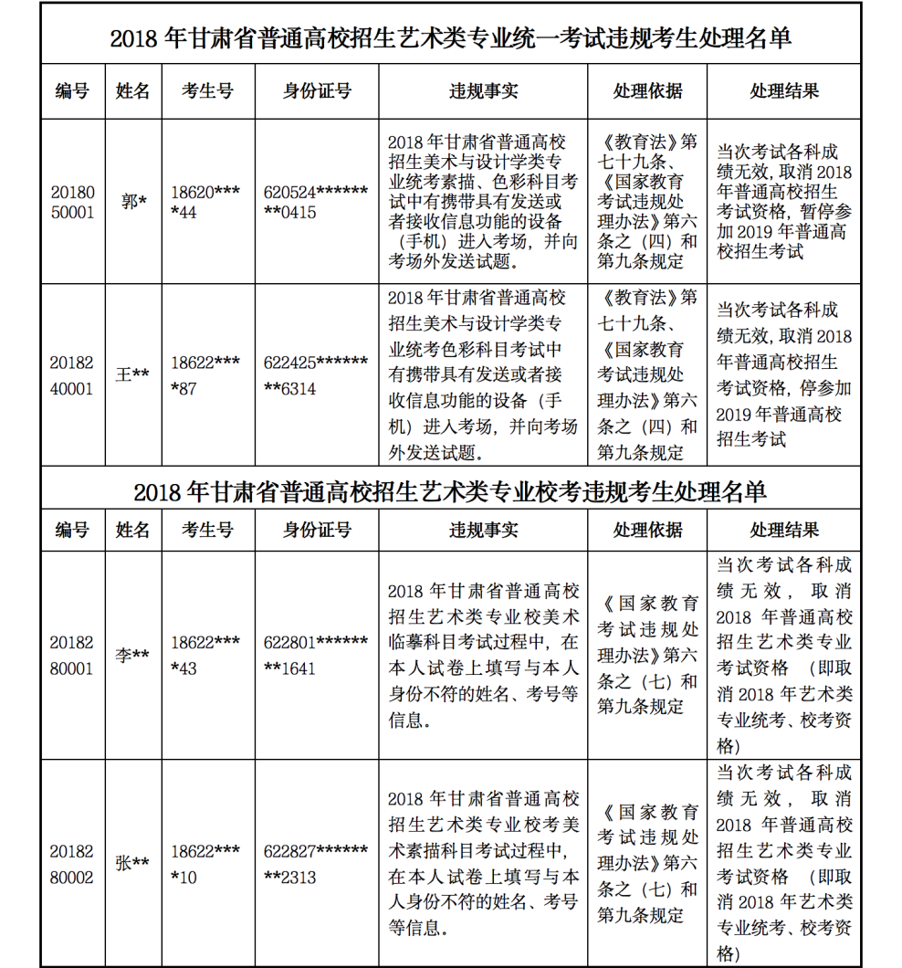 一、甘肅省近年普通高校招生藝術類專業違規考生處理情況回顧