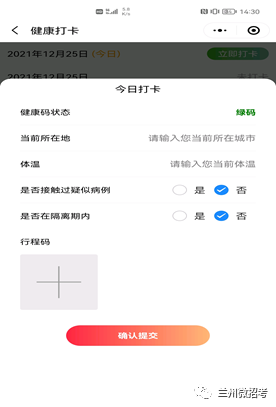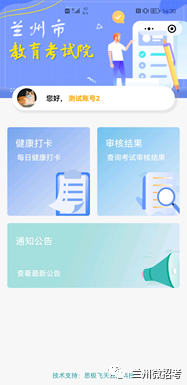 為進一步做好參考考生健康情況排查,便于管理,蘭州市教育考試院開發了小程序“蘭教E考通”,請參加蘭州考區面試的考生掃描二維碼進入,于考前十四天(2021年12月25日-2022年1月7日)進行每日健康打卡。流程如下: