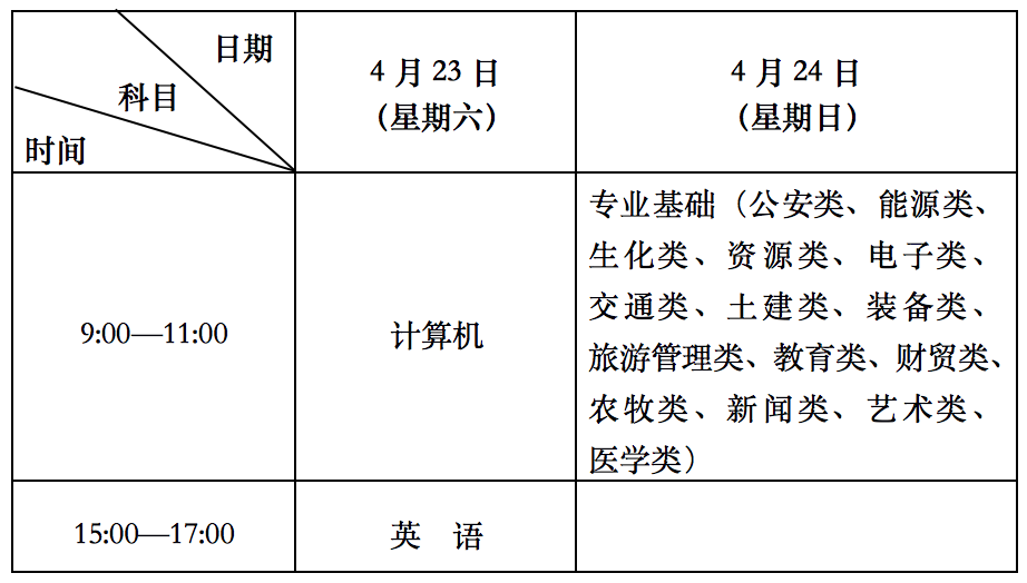 (四)考試時間。全省統一考試時間為2022年4月23日至24日。具體考試時間與考試科目安排如下(北京時間):