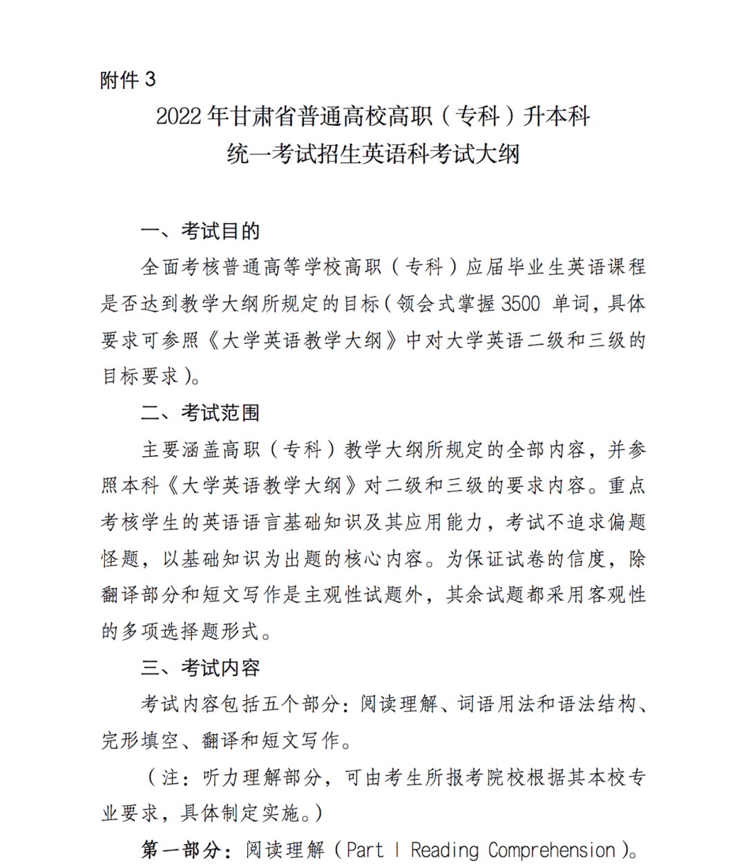3.2022年甘肅省普通高校高職(專科)升本科統一考試招生英語科考試大綱