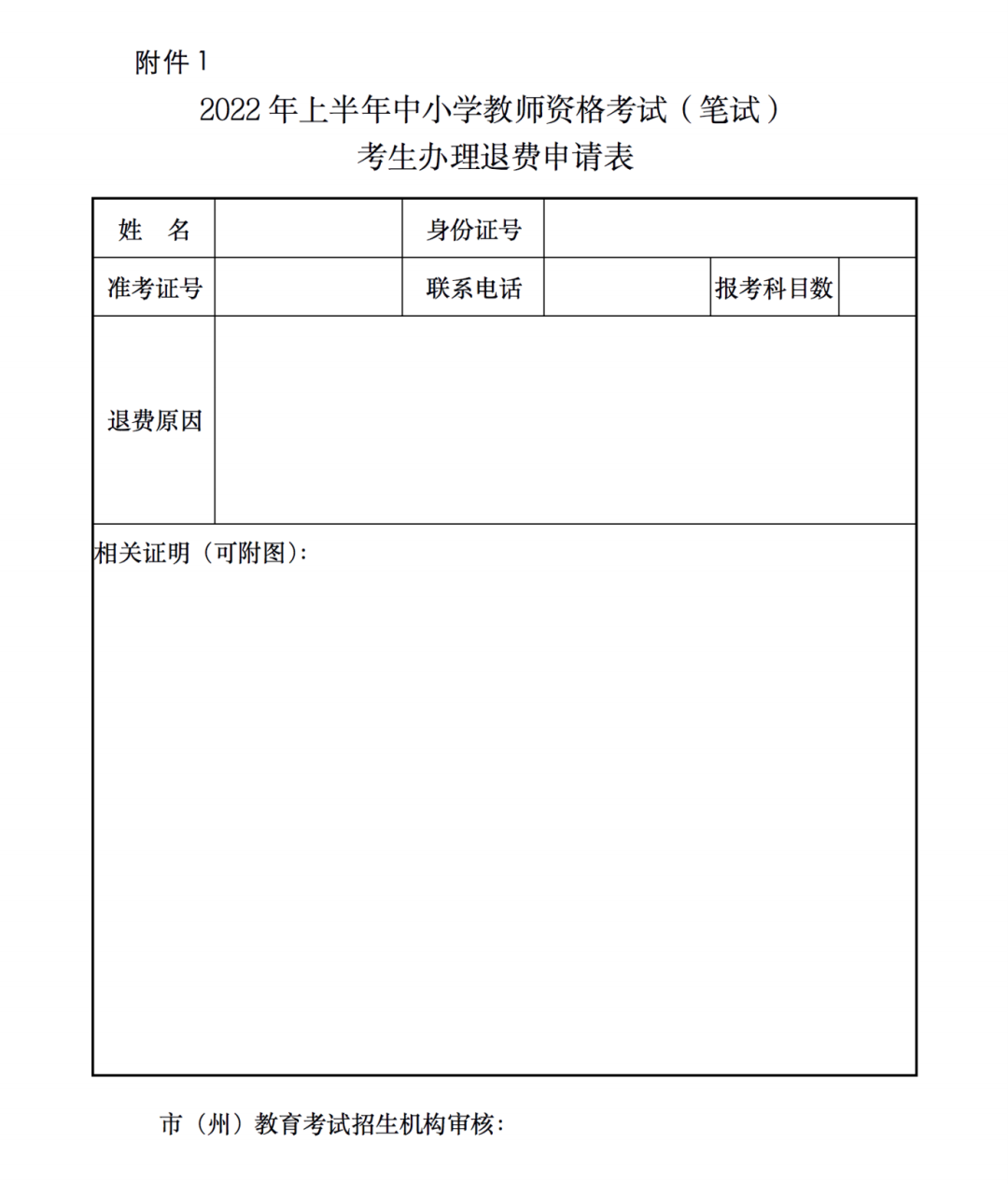 申請退費的考生需填寫《2022年上半年中小學教師資格考試(筆試)考生辦理退費申請表》(附件1),填寫信息須與報名信息一致。填寫退費原因,至少1項能證明本人因疫情防控原因未能參加考試的相關材料(如手機短信截圖、考試期間“健康碼”“行程卡”截圖,所在社區張貼的通知公告、屬地疫情防控等部門(單位)的相關通知等),截圖應清晰完整,并粘貼至附件1中。
