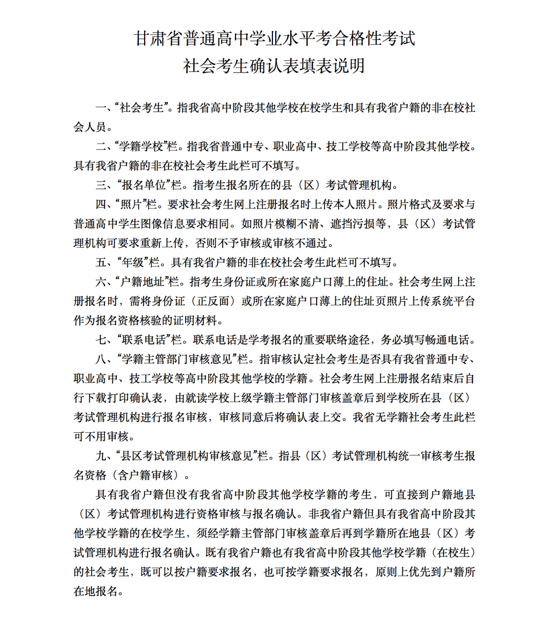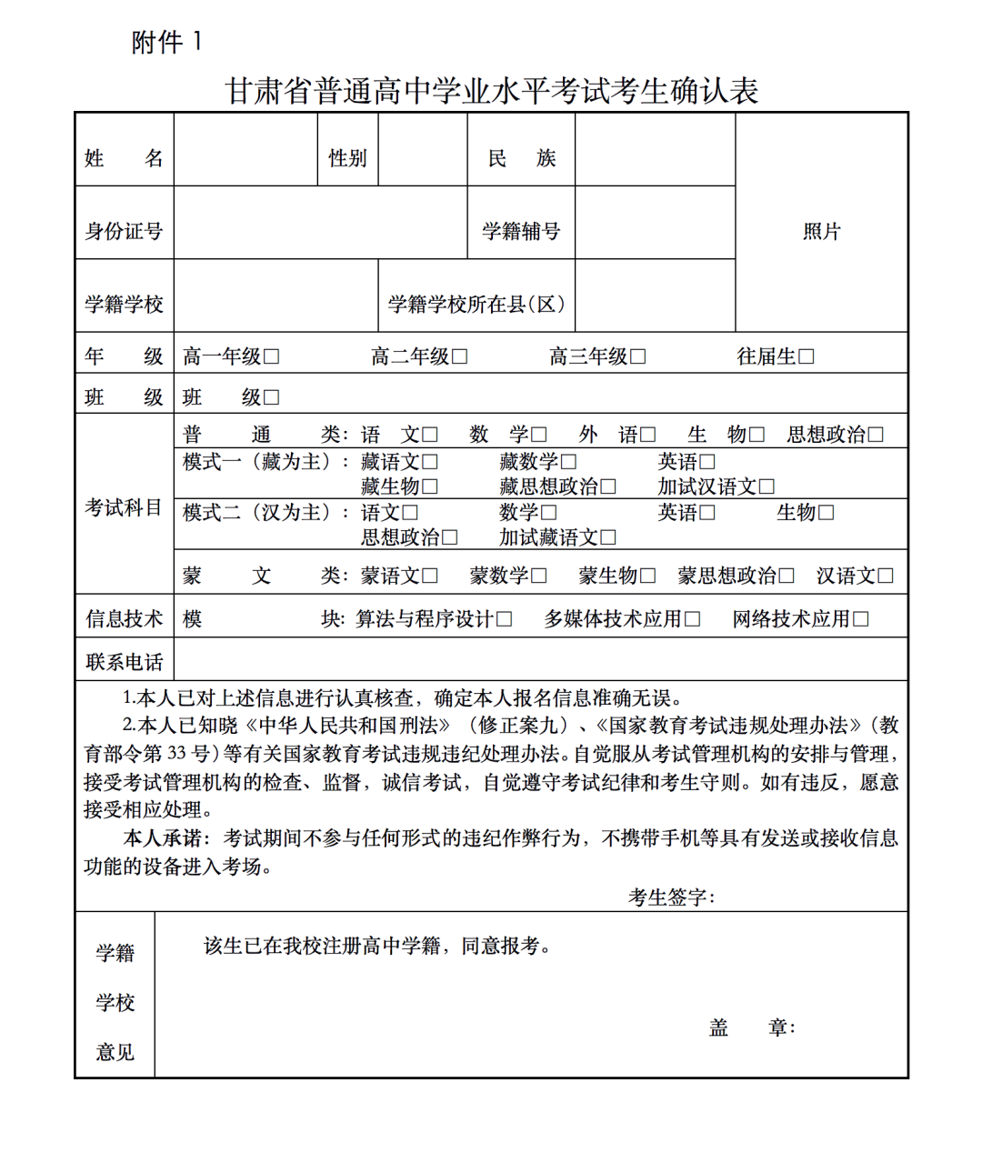 2.2020級普通高中二年級學生及往年考試成績不合格的學生打印《甘肅省普通高中學業水平考試考生確認表》(見附件1);2021級普通高中一年級學生打印《甘肅省普通高中學業水平合格性考試考生確認表》(見附件2);社會考生打印《甘肅省普通高中學業水平合格性考試社會考生確認表》(見附件3)。