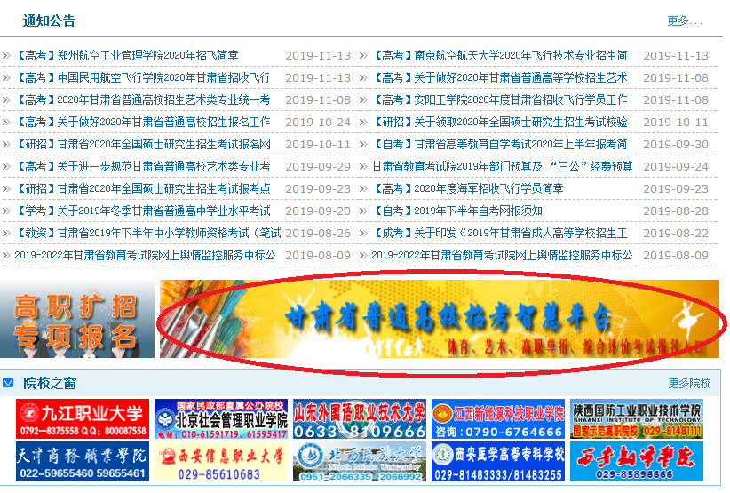 點(diǎn)擊“通知公告”欄目下方的“甘肅省普通高校招考智慧平臺(tái)”。