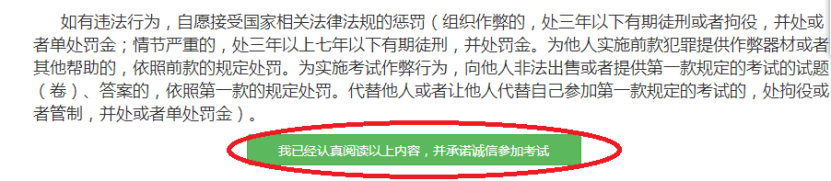 《考生須知》閱讀完成后,請(qǐng)開始閱讀《報(bào)考承諾書》,閱讀完成后請(qǐng)點(diǎn)擊“我已經(jīng)認(rèn)真閱讀以上內(nèi)容,并承諾誠信參加考試”。