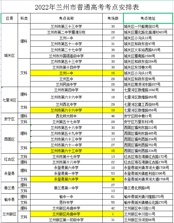 蘭州市2022年普通高考考點安排分別為: