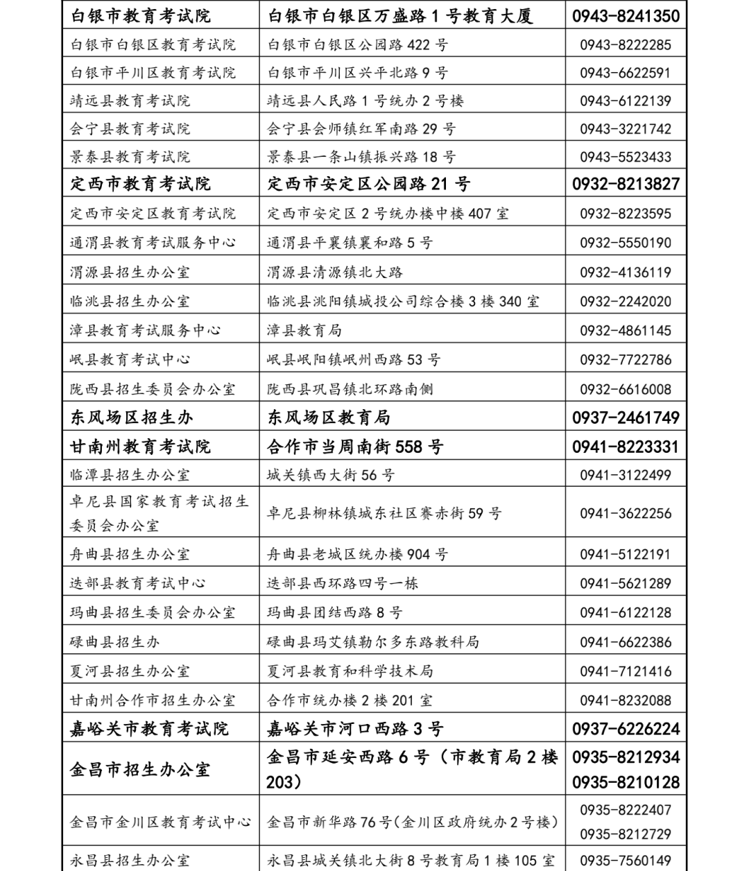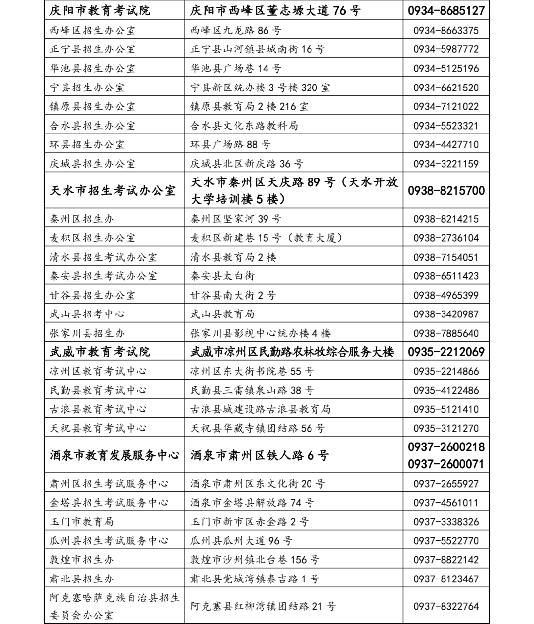 2022 年甘肅省各級教育考試招生機構咨詢服務聯系方式