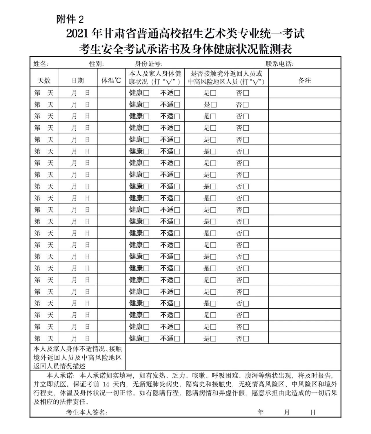 2.考生須從考前14天開始做好每日體溫測量、記錄并進行健康狀況監測,如實填寫《2021年甘肅省普通高校招生藝術類專業統一考試考生安全考試承諾書及身體健康狀況監測表》(見附件2)。出現異常情況的,要及時報告學校或縣(區)教育考試招生機構,并進行診療和排查。