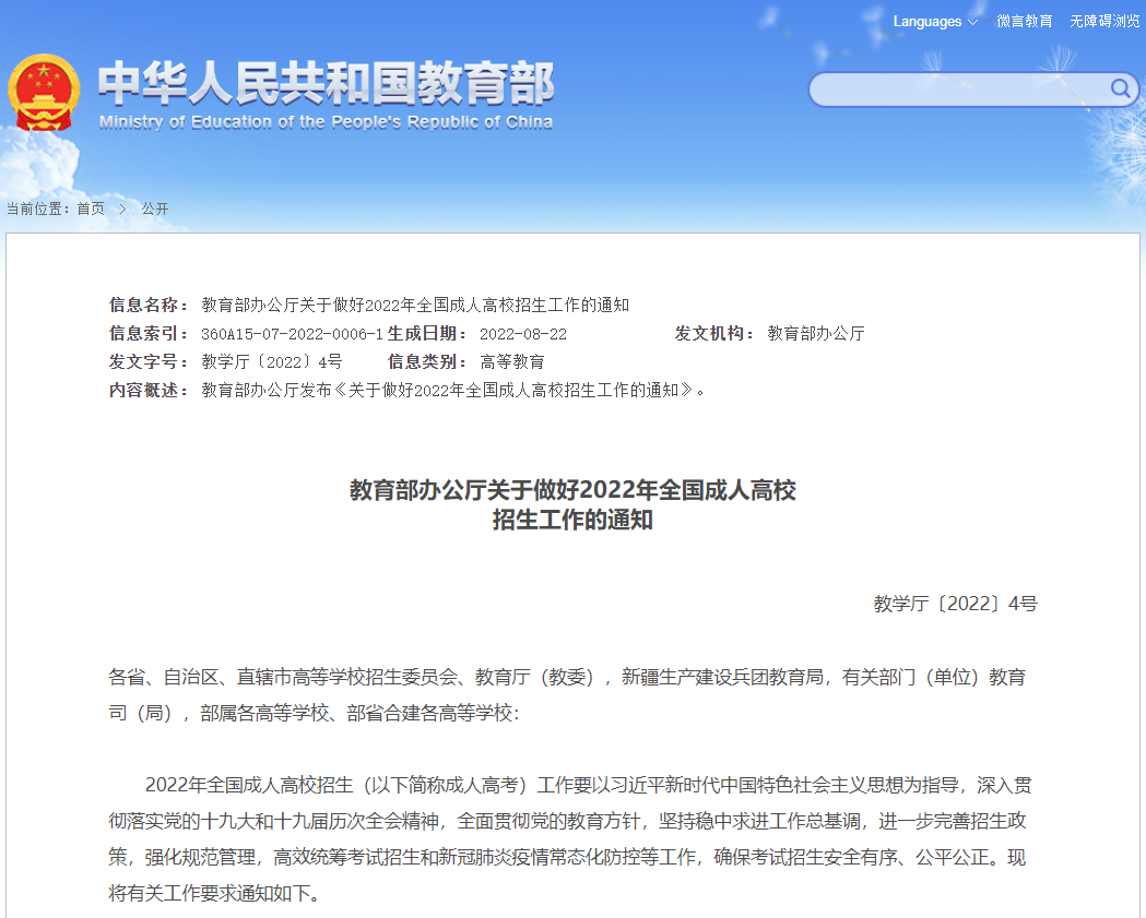 教育部辦公廳關于做好2022年全國成人高校招生工作的通知