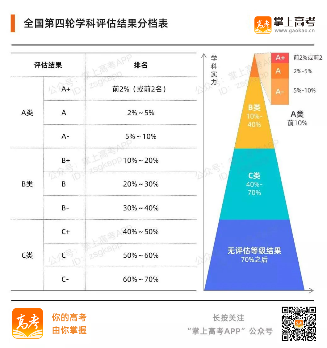 教育部學科評估結果按“分檔”方式呈現,將前70%的學科分9檔公布,其中前2%(或前2名)為A+,2%~5%為A,5%~10%為A-,10%~20%為B+,20%~30%為B,30%~40%為B-,40%~50%為C+,50%~60%為C,60%~70%為C-。排名越高,也就代表學科實力越強勁。