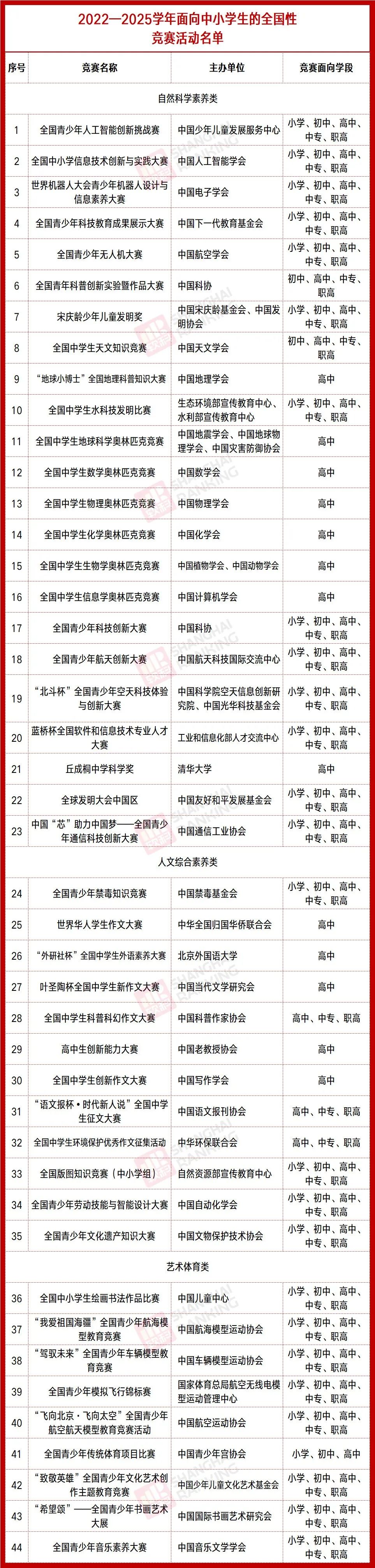 日前,教育部公布了2022-2025學年面向中小學生的全國性競賽活動名單,共有“全國青少年人工智能創新挑戰賽”等44項競賽進入名單。