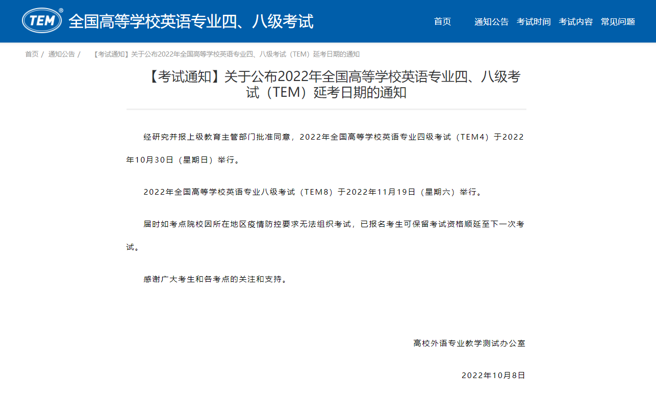 據高校外語專業教學測試辦公室網站消息,經研究并報上級教育主管部門批準同意,2022年全國高等學校英語專業四級考試(TEM4)于2022年10月30日(星期日)舉行。