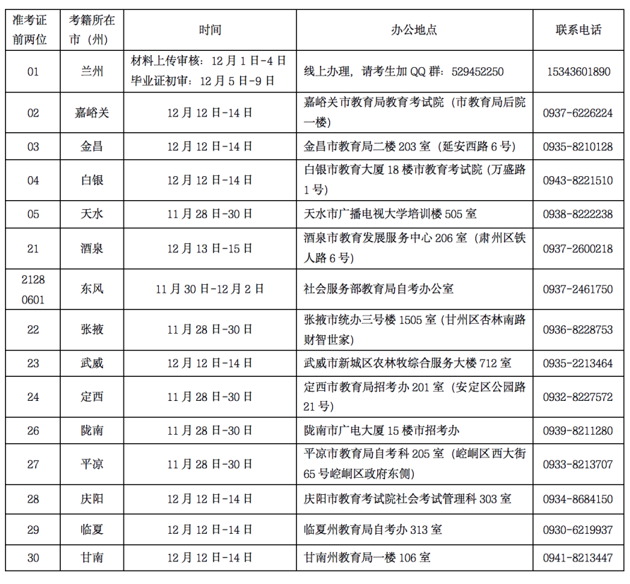 2022年下半年甘肅省高等教育自學考試社會型考生各市州畢業(yè)初審時間及聯(lián)系方式