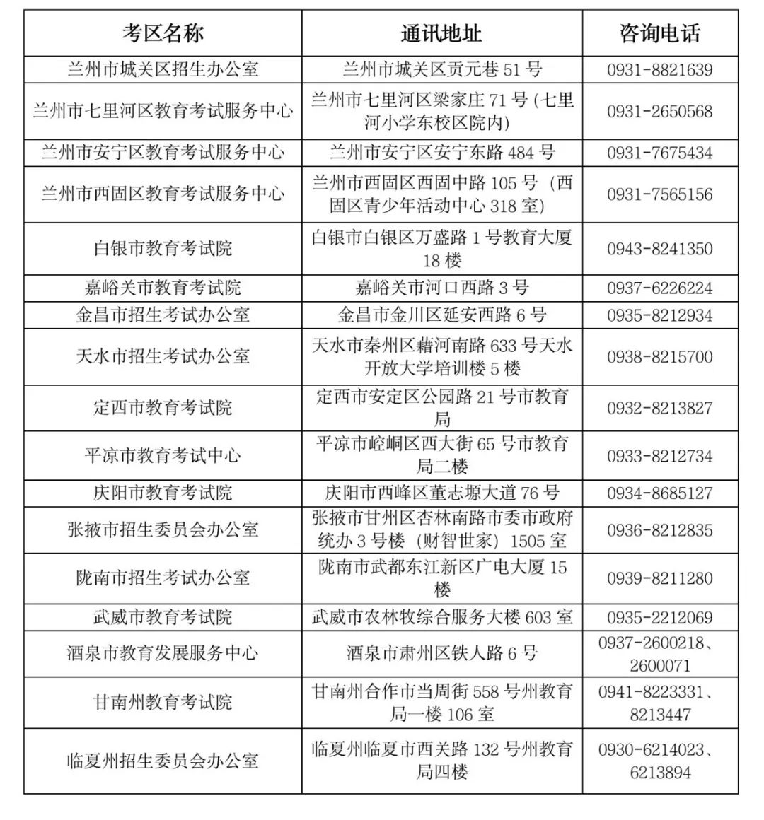 請考生提前做好備考工作,密切關注甘肅省教育考試院官方網站、官方微信公眾號,及時了解相關考試信息,如有疑問可咨詢報考所在地教育考試招生機構(詳見附件)。