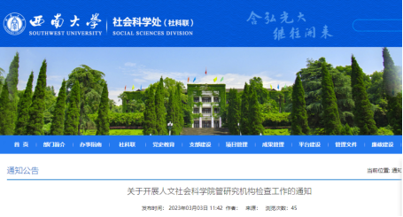 3月3日,西南大學社會科學處發布《關于開展人文社會科學院管研究機構檢查工作的通知》(以下簡稱《通知》),對學校人文社會科學領域院管研究機構開展檢查工作。