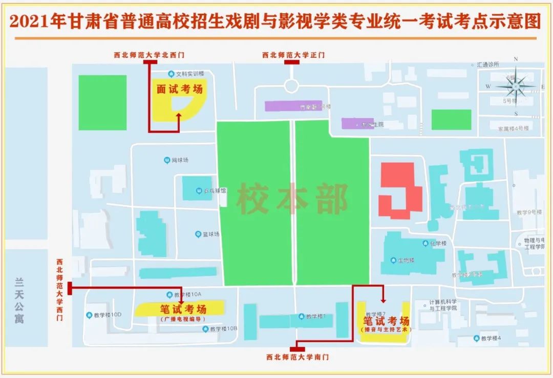 為做好新冠疫情疫情防控工作,確保考生順利入場,考生須按照規定的出入口及路線出入相應考點。考生應提前在考點門口排隊,預留足夠時間配合考點工作人員進行入場核驗。具體路線見《2021年甘肅省普通高校招生戲劇與與影視學類專業統一考試考點示意圖》。