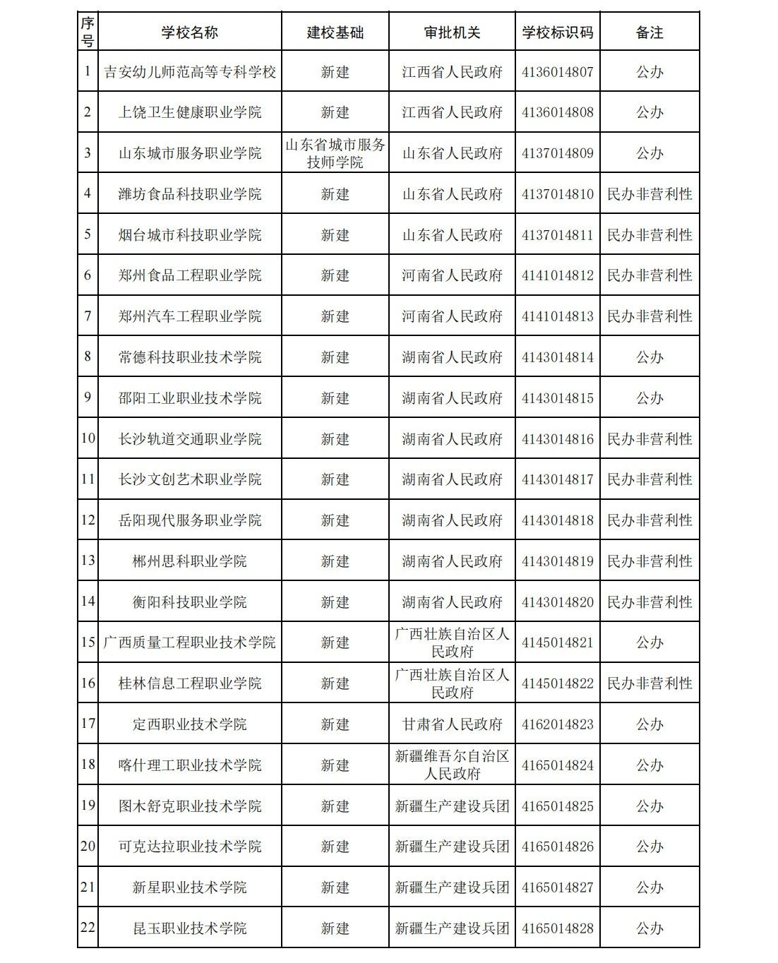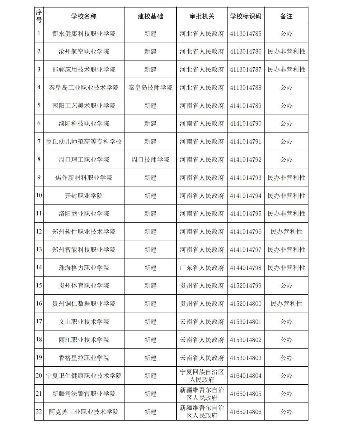 省級人民政府審批設置實施專科教育高等學校備案名單
